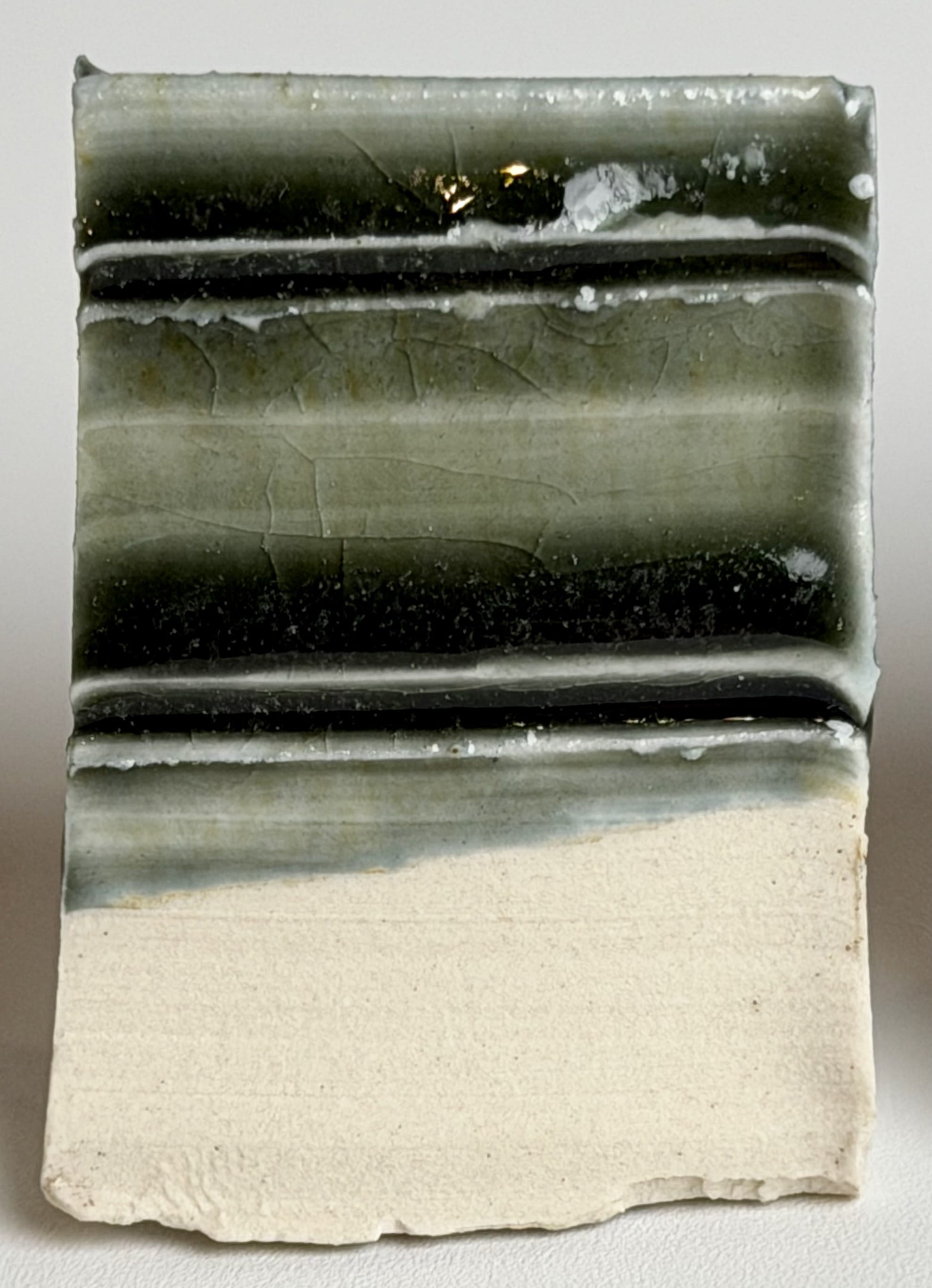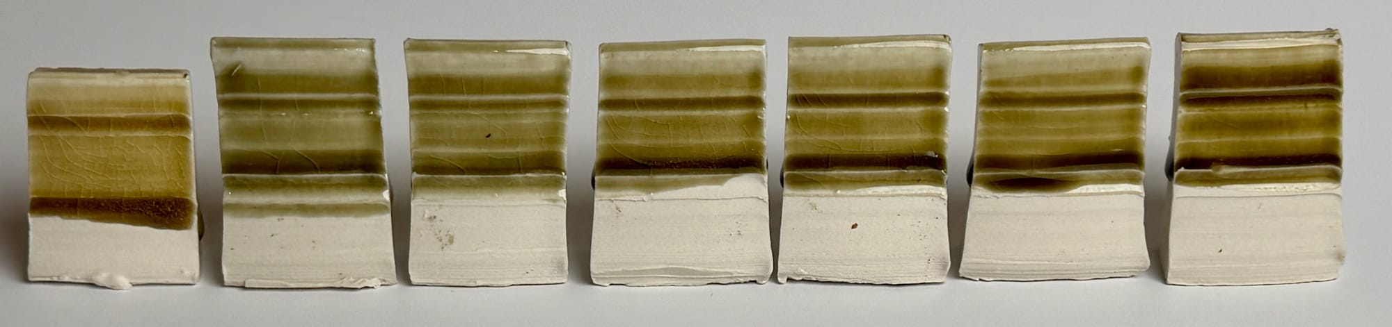 In this case the green hues are quite subdued with both the natural iron oxide and the introduced ROI dominating. Tile 7, 2% ROI, is well on its way to a familiar Tenmoku.