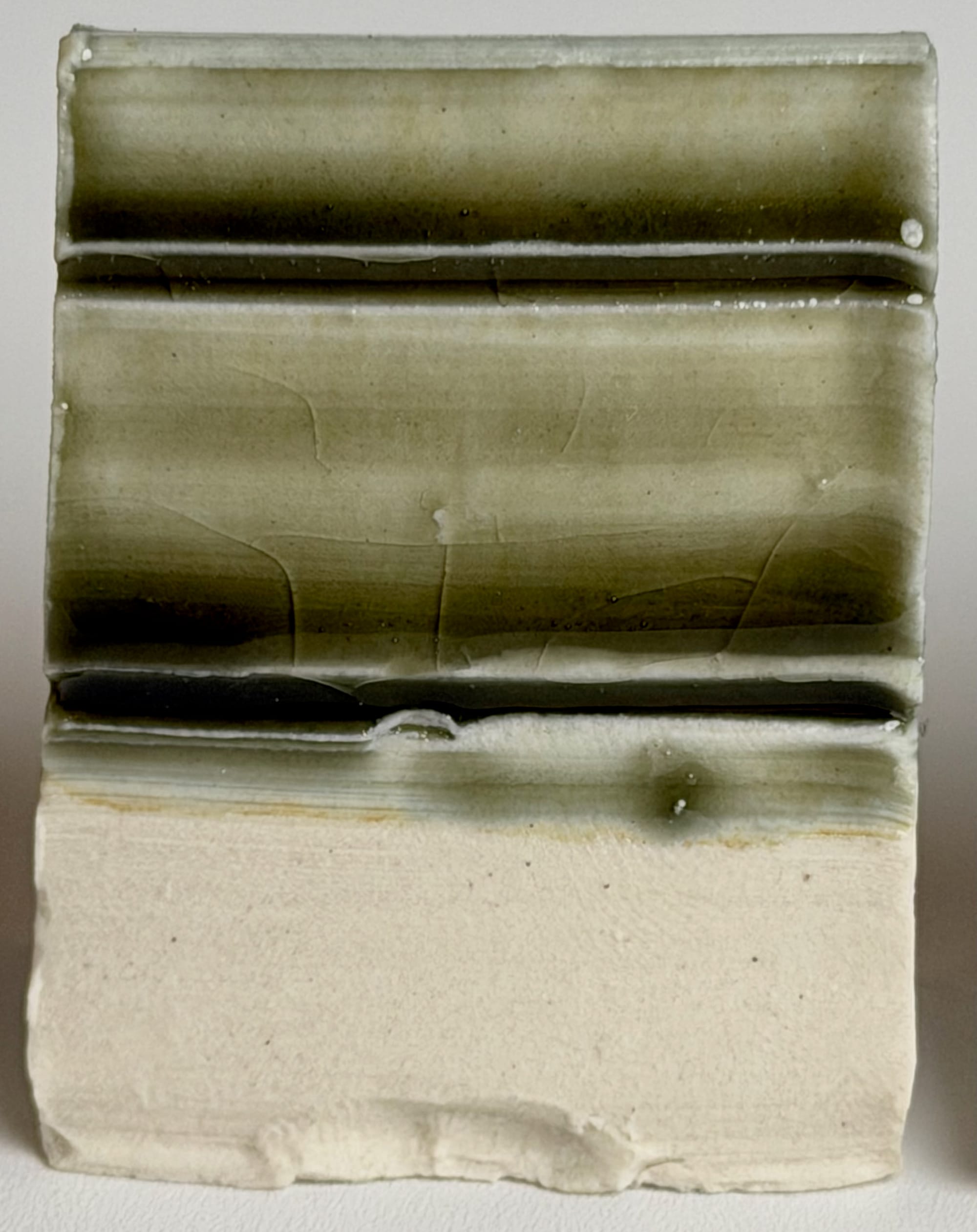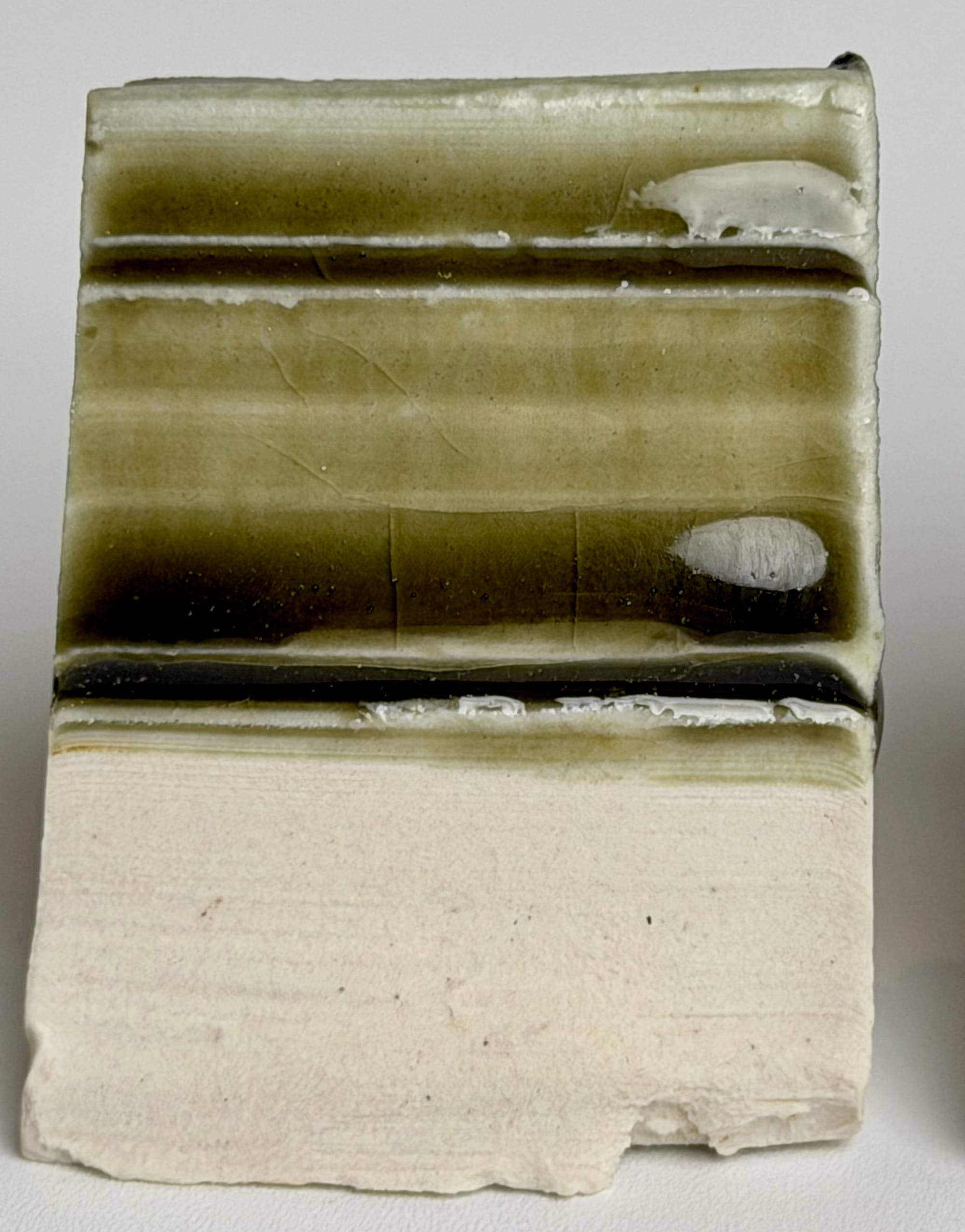Looking at Tile 6, 0.25% Cobalt Carbonate and 1.0% ROI, we observe an olive hue with browns emerging from the thicker areas as the ROI becomes dominant faster than with the 0.5% Cobalt Carbonate set, as would be expected. Crazing seems lighter again and we see hints of micro crystals.