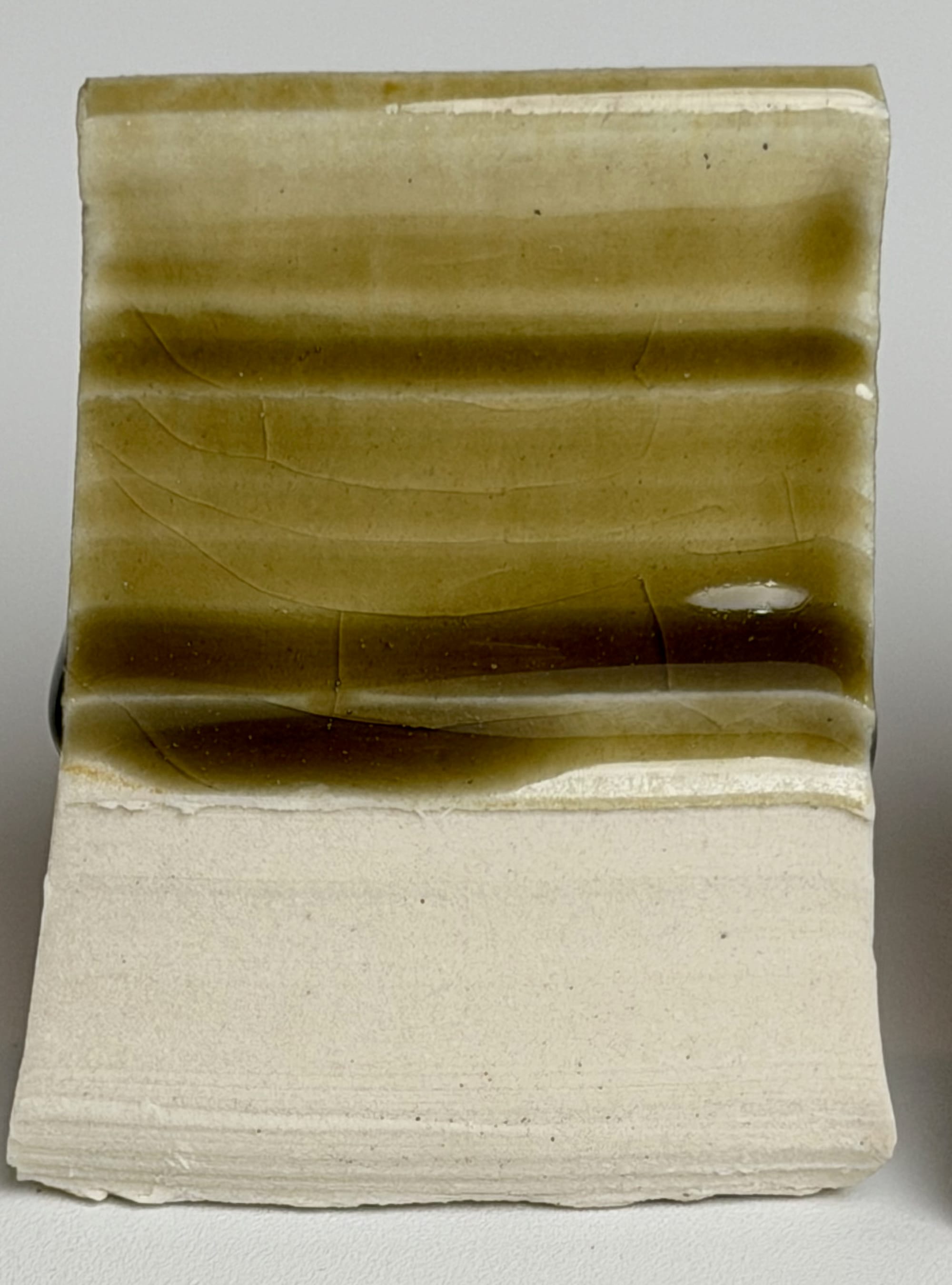 Test Tiles 1 and 11 (above) show our starting points. On the left is Base-S, a honey-colored matte glaze that shows complexity with no crazing. On the right is Base-Z, also honey-colored, but glassy, more melted, more runny, shows micro crystal development where thicker, and is crazed.