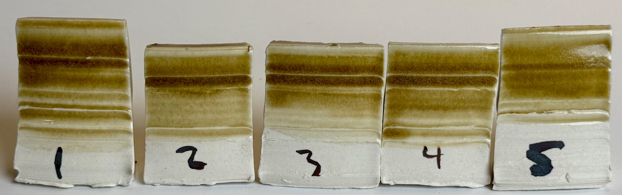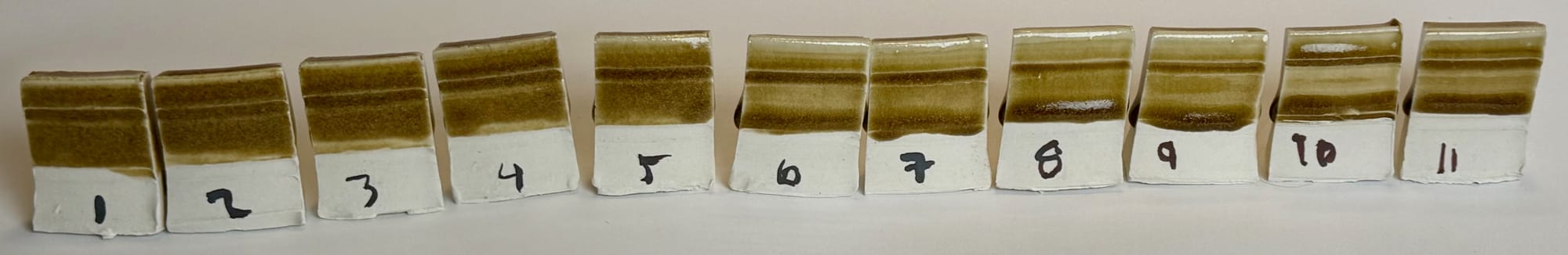 Below repeats the gradient of ROI using a the base glaze with 0.5% Cobalt Carbonate added.