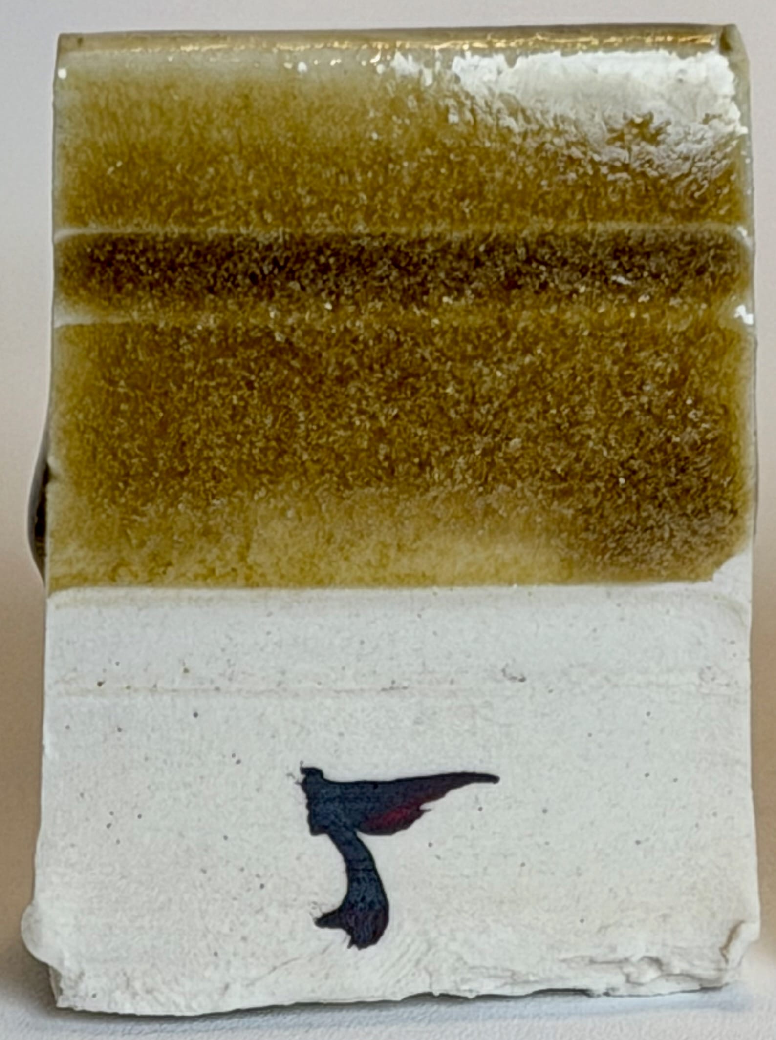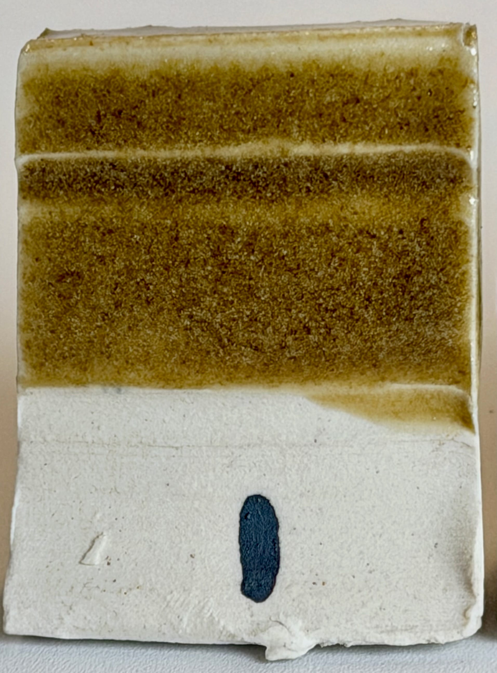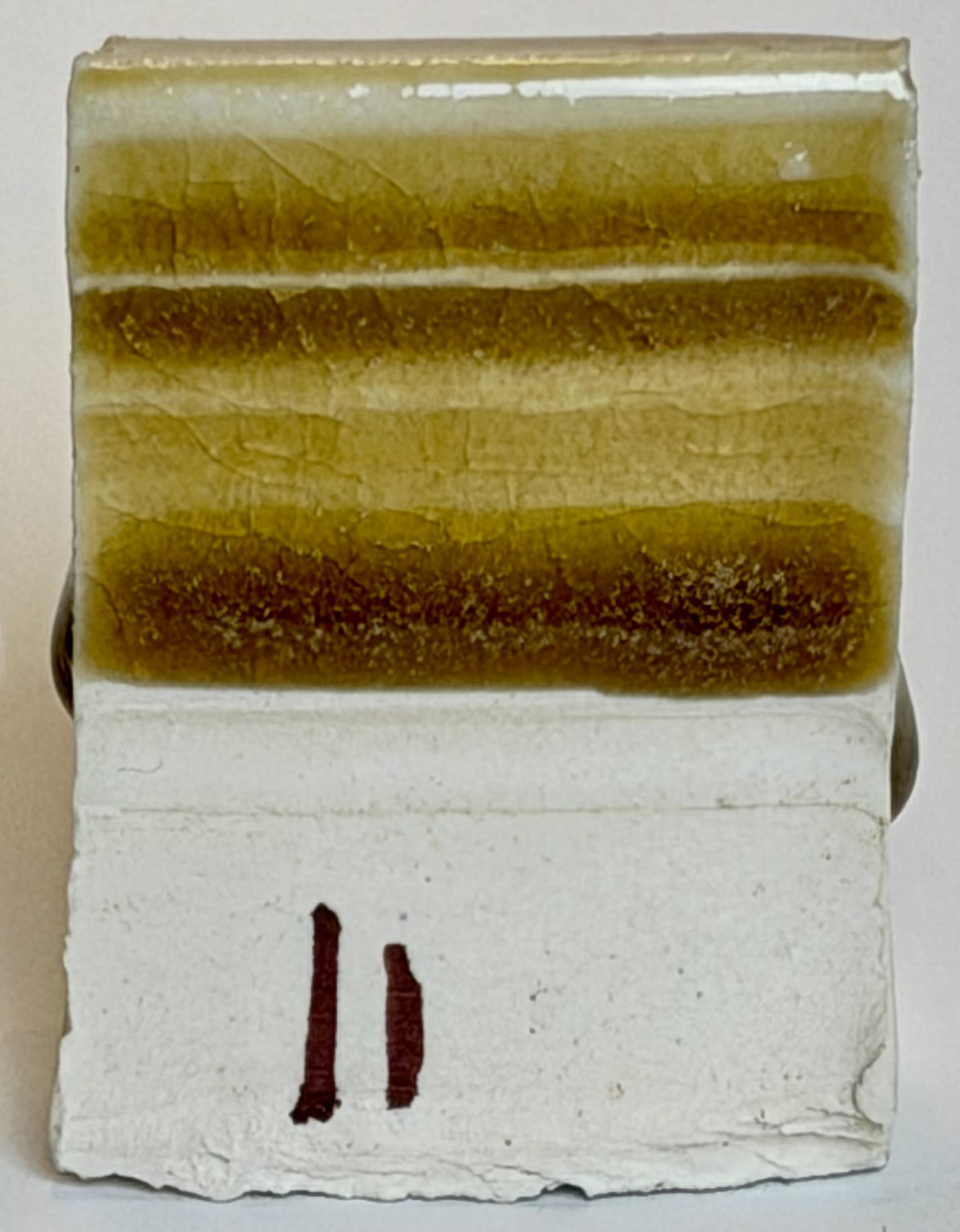 The above tests were performed again and extended. Overall, the glaze is fully melted, glassy, exhibits micro crystals where thicker and crazes. The Batch 2 results remain similar to Batch 1. A number of these tiles are attractive and worth perusing or continuing to peruse.