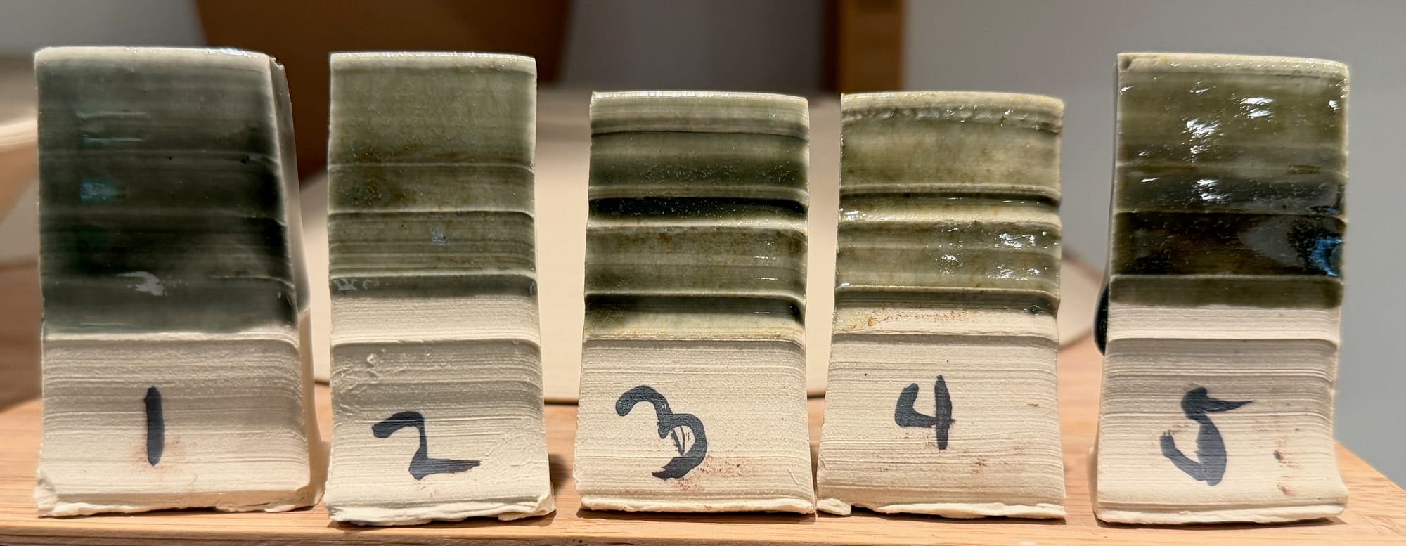 Results similar to Batch 1 are obtained once again. Crazing persists but decreases as iron is added. Test Tile 4, 0.25% Cobalt Carbonate and 1% Red Iron Oxide corresponds chemically to results shown here. Now that we know how to play with cobalt and iron combinations, the motivation for this test is to start to refine a new Green Celadon formula for 2026.