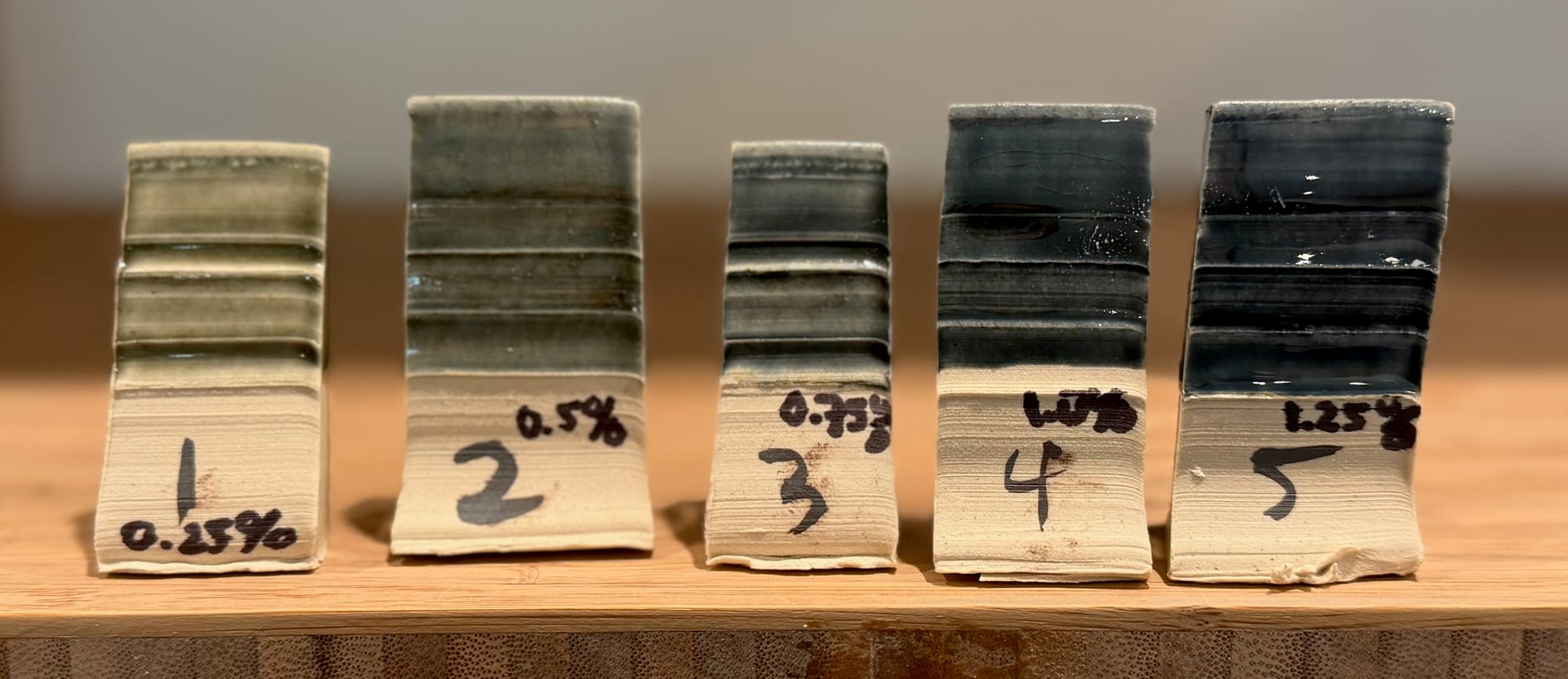 The final test presented is a line progression starting with Test Tile 1 above, 0.25% Cobalt Carbonate and blending Red Iron Oxide in concentrations of 0%, 0.25%, 0.5%, 0.75% and 1.0%.
