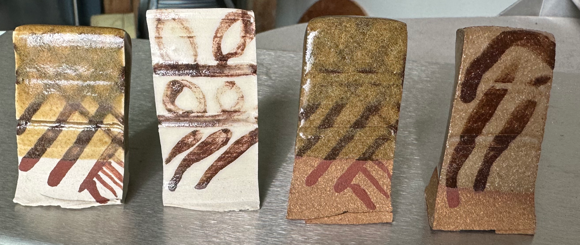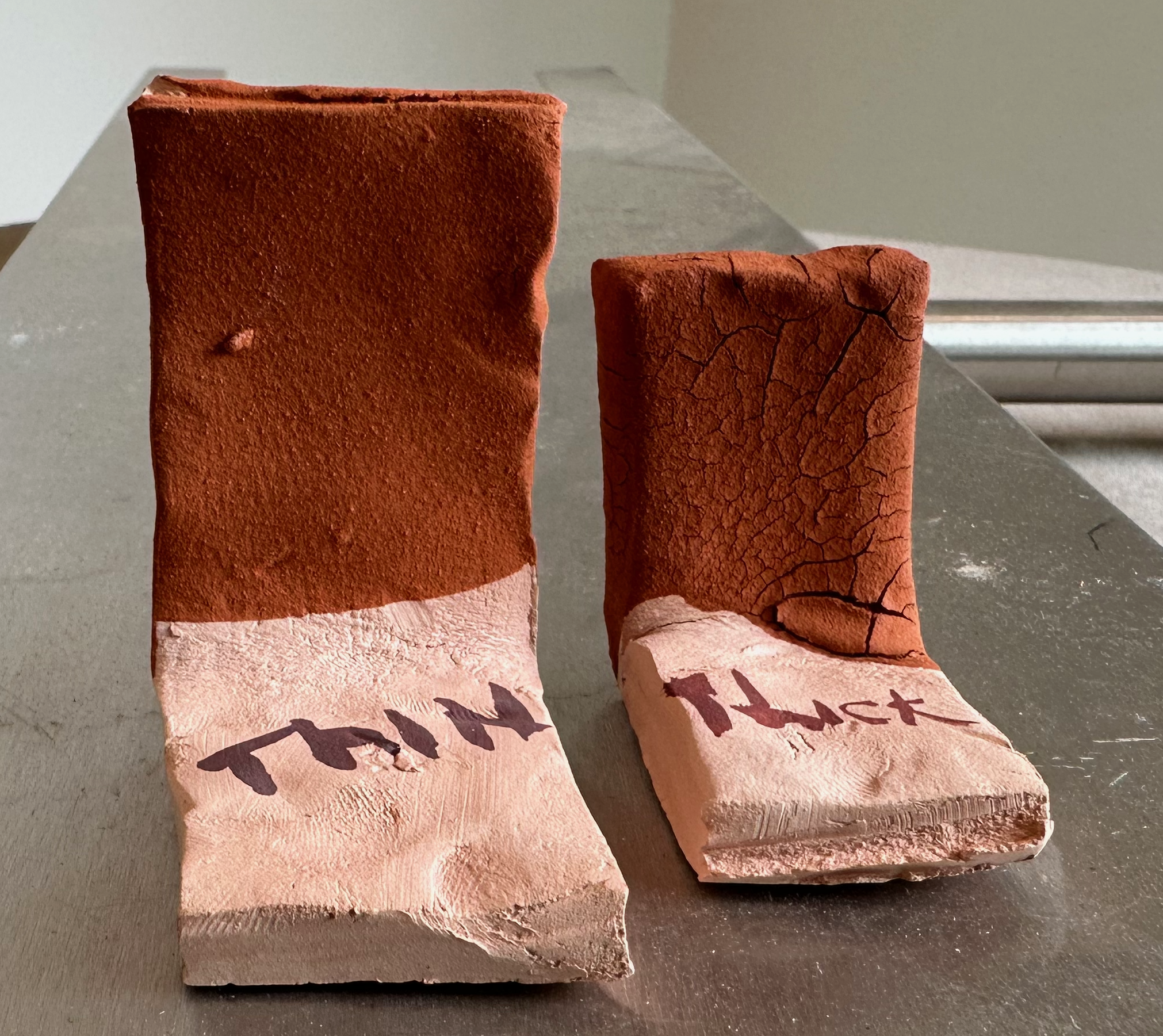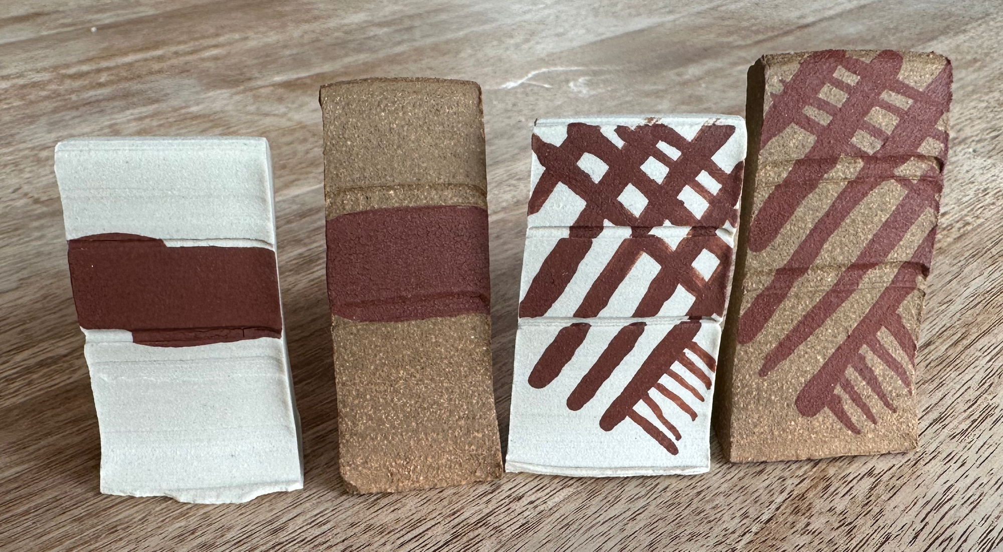 The resulting 120M product is refined and easy to apply (above). There is a lot of iron naturally in the clay and so it fires a dark-red in my oxidized kiln, much darker than the bisque ware above. It's attractive in an Earthy way.