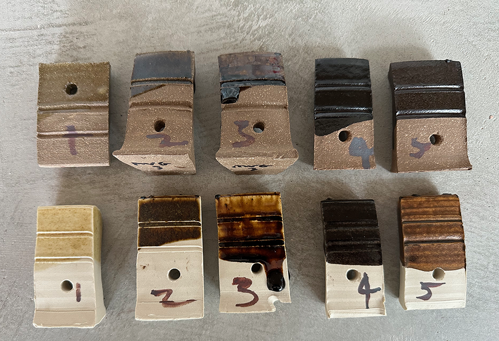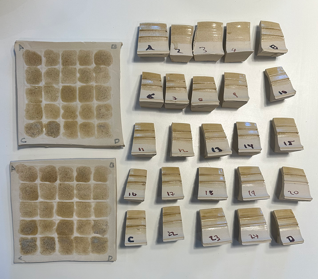 - A recent 70/30/10% MV Granodiorite / Wollastonite / Silica version sieved at 60M, 80M and 120M, which are more matte and darker, on B-Mix (Tiles 2-4).