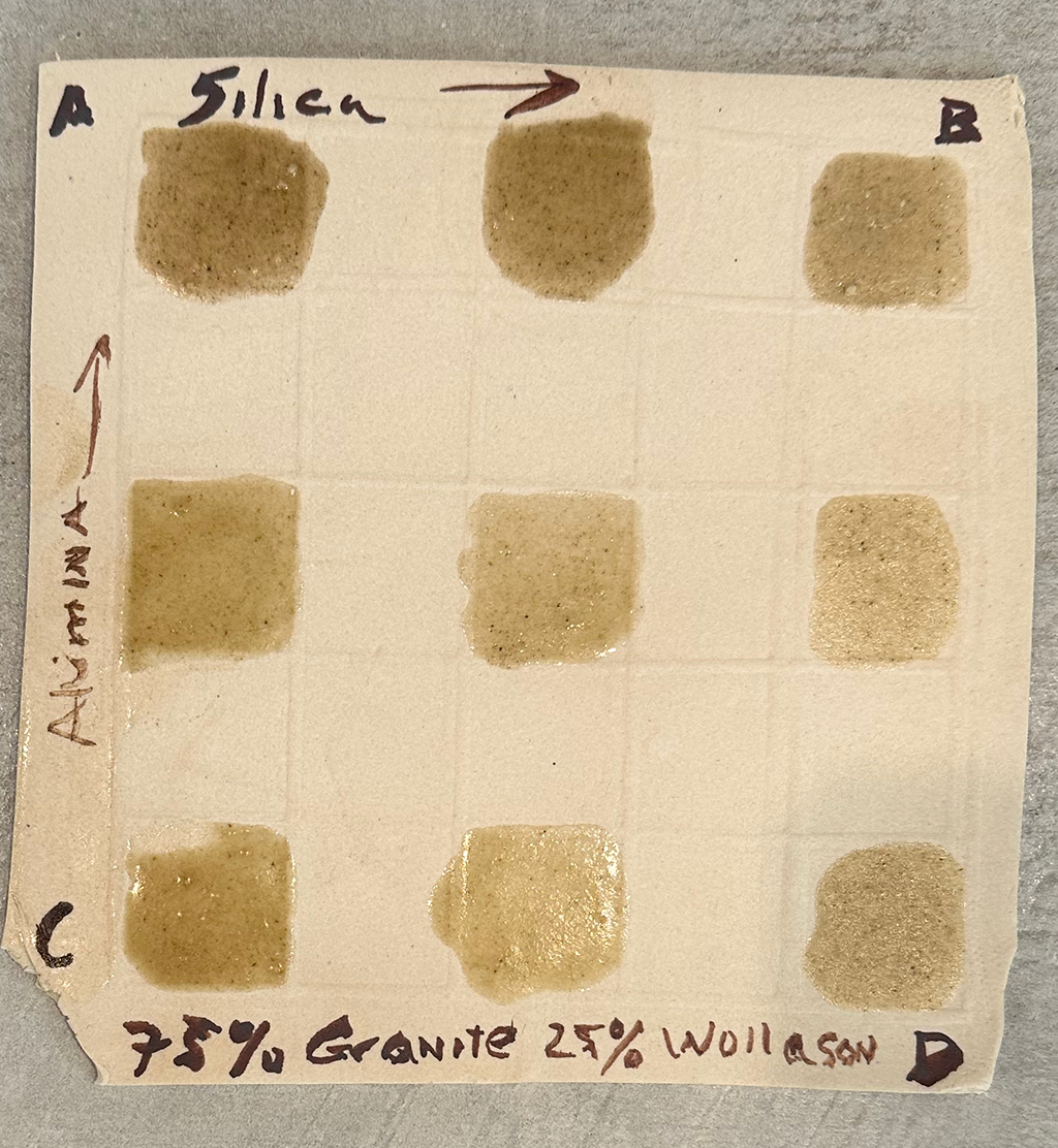 Method: Each corner glaze contained 300 gm of material and 500 ml of water. The flux corner C was 70% Granite and 30% Wollastonite, the current base receipe. 20 gm of Silica was added to corners B and D and 15 gm of EPK (alumia) was added to corners A and B.
