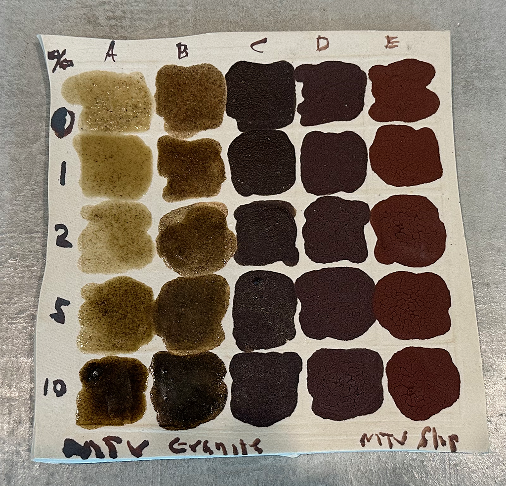The following documents "base glaze" testing with the granite and its associated local (primary) clay. Performed closely in parallel are the Iron Oxide (Tenmoku) tests, as well as the Cobalt and Copper testing.