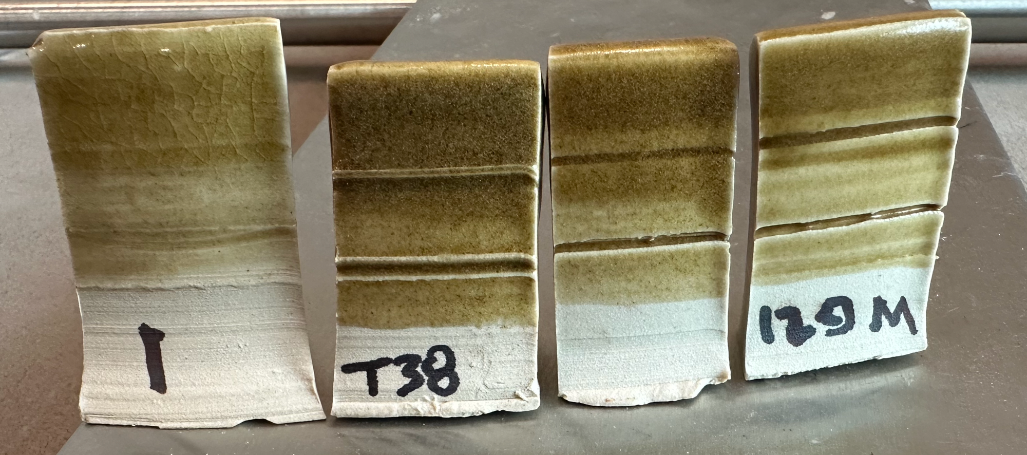 - The earlier batch had a better flux balance to achieve a glossy finish than when more mica (and iron) is present. The three tiles from the mica-rich batch are all matte, though there is a slight improvement in the melt from 60M to 120M.