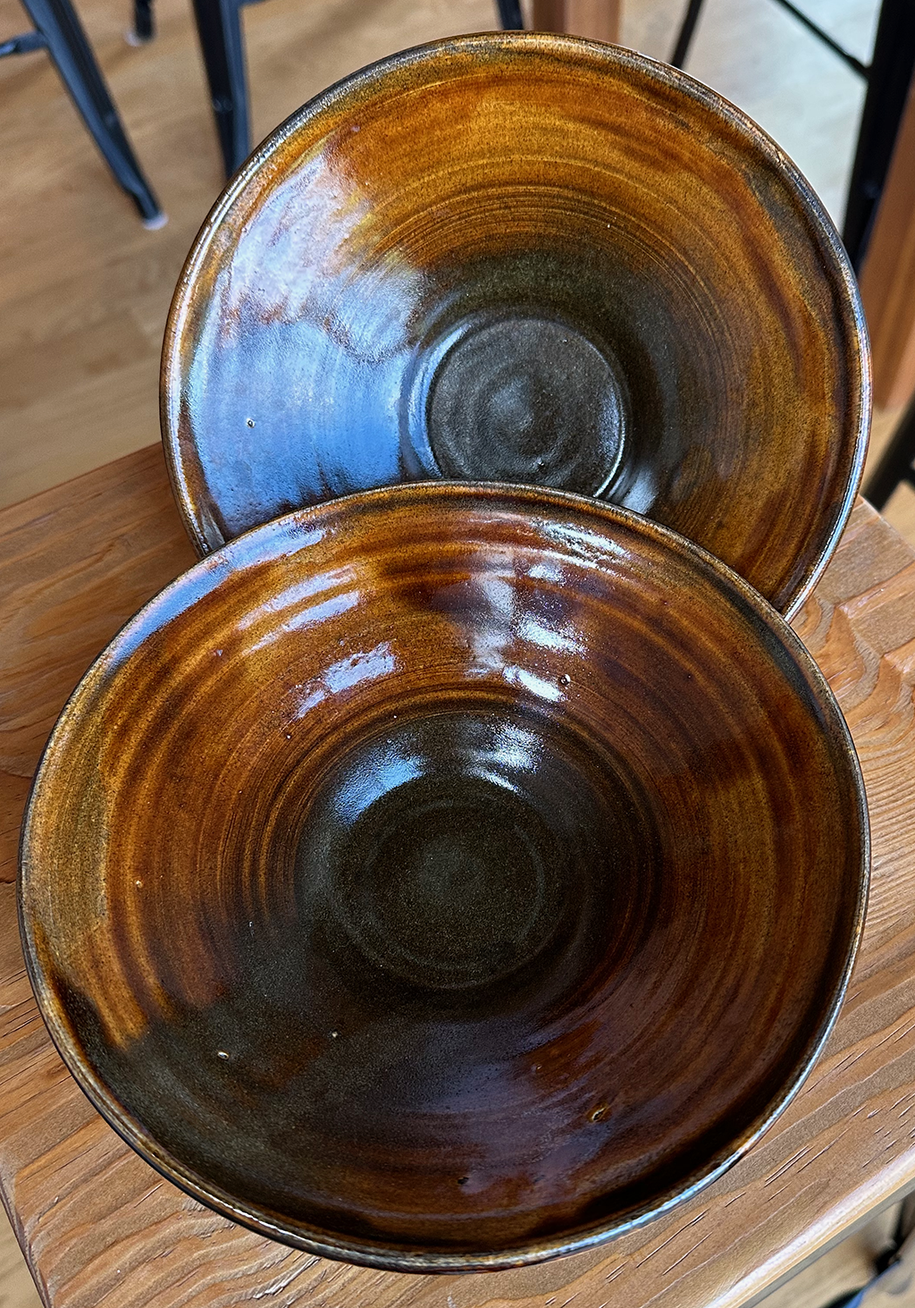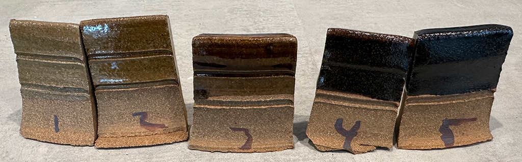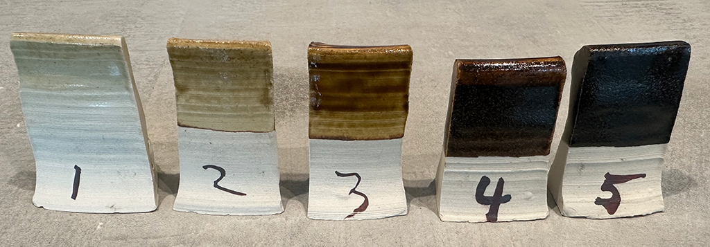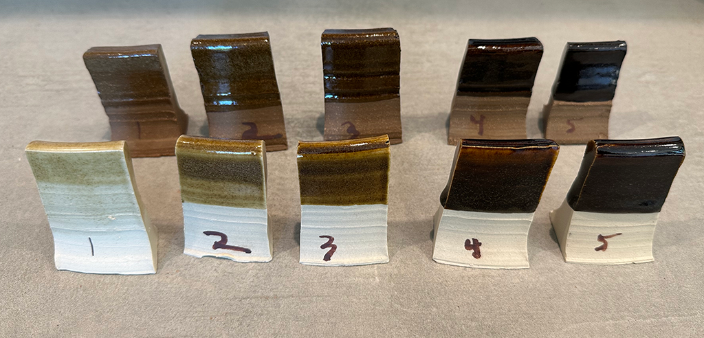 A good test. Glaze looks good on both clay bodies. It’s melted and not crazed (much). 10% iron oxide was the most interesting, but they all warrant exploration. The base glaze (tile 1) is not clear and shows the iron that exists in the granite. The glaze has some interesting speckles that we see crop up elsewhere.