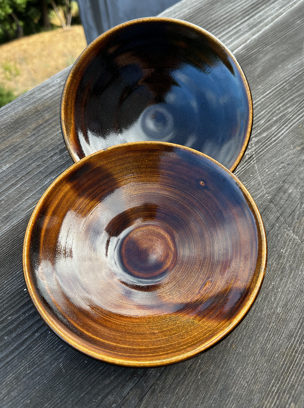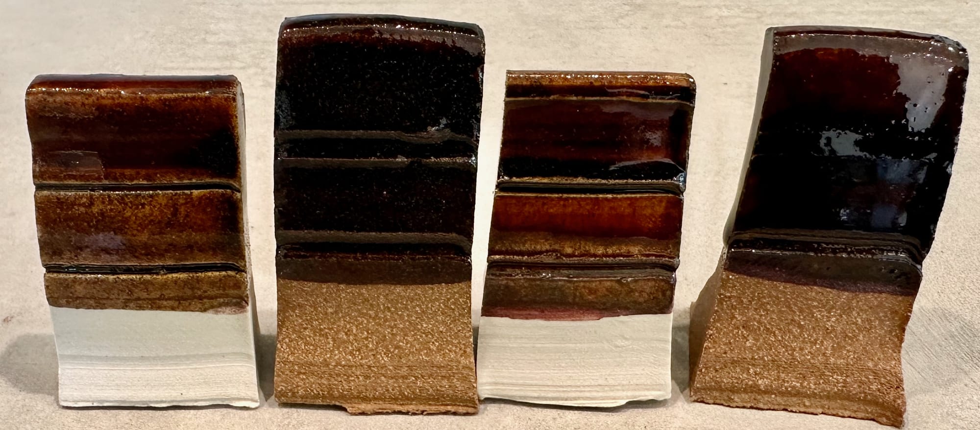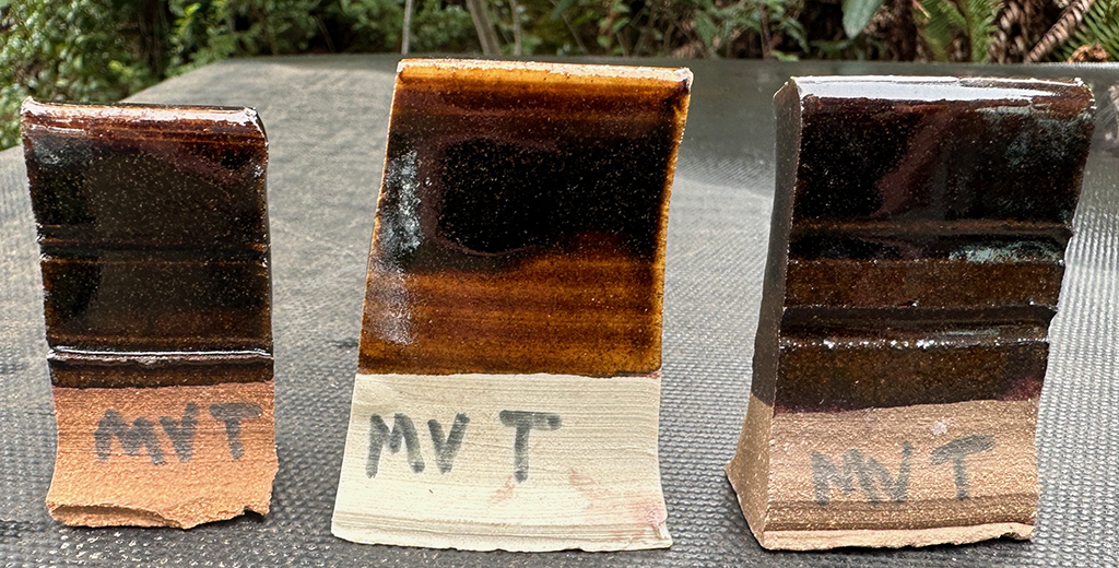 In this test I'm using the Mt Vision Tenmoku with 8% Red Iron Oxide and SG 1.50. I wanted to see what happened at the higher SG. I've also introduced a third clay body, Sedona Red.