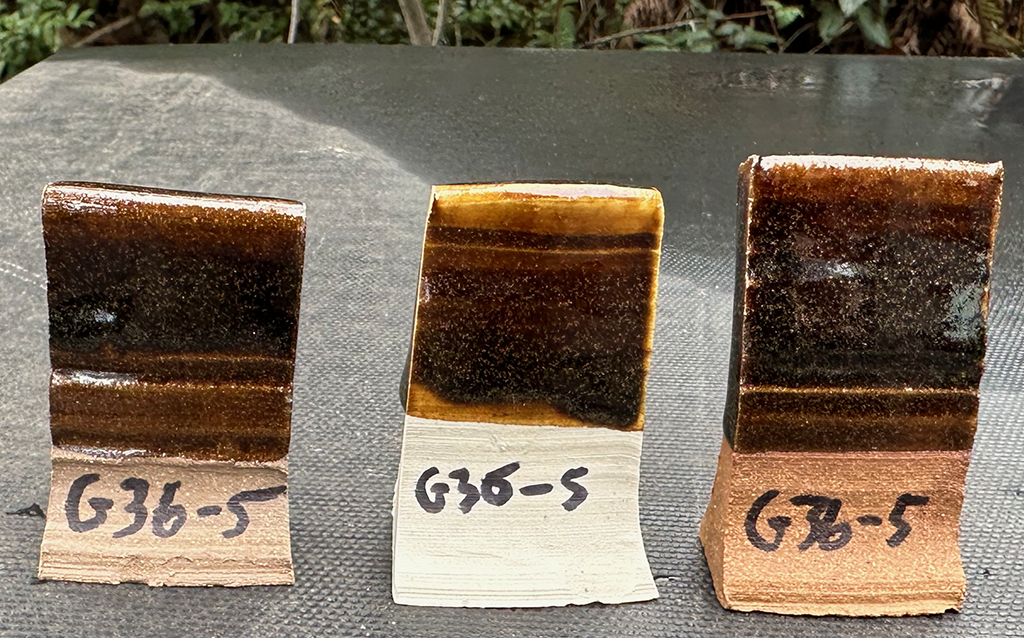 This is a good result. All three tiles are interesting, glossy and uncrazed. It's confirming a suspicion I've had for a while that a higher SG will produce better results, and lowing the iron content would compensate somewhat for the extra thickness. Also, the kilns are firing similarly, or so it appears in this case. In this firing, G36, the tiles were on the top shelf where Cone 6 was passed and Cone 7 was breached (the bottom of the kiln is always cooler).
