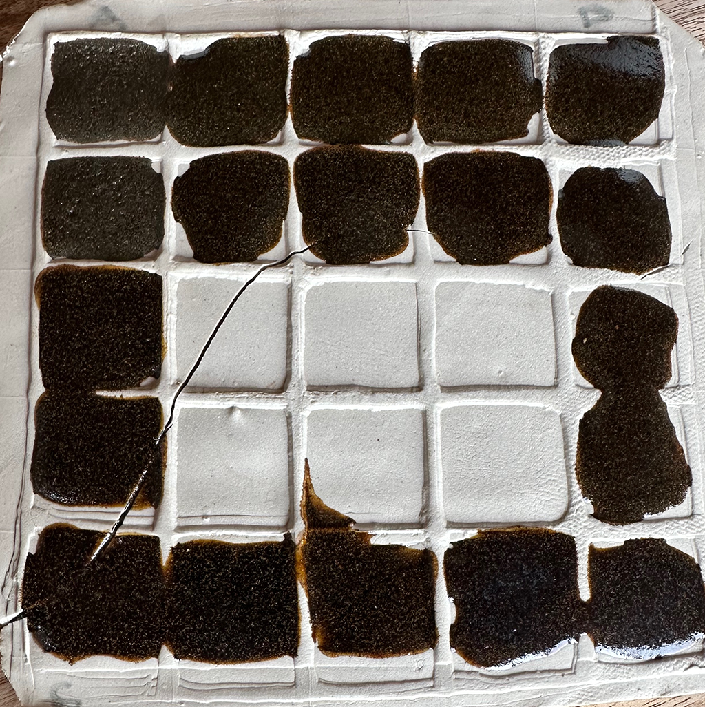 This is one of the first tile tests performed in the main kiln. To date I've used the test kiln for these experiments and I've noticed small differences in outcomes over time, even though I've made some attempts to harmonize the two environments. For example, items sometines fire more matte in the main kiln than the equivallent tiles in the test kiln, but not always.
