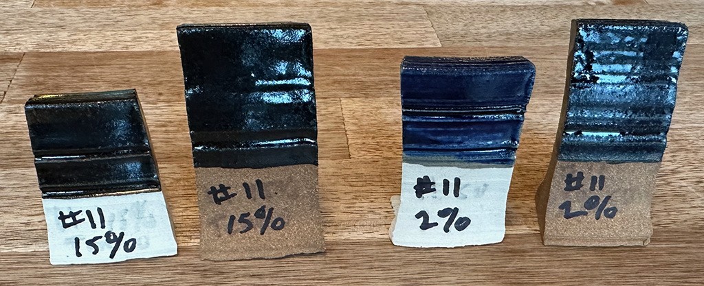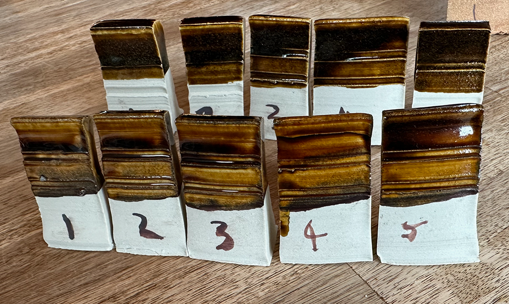 Also, for kicks, I refired the 15% tenmoku batch from Test 6, which simulated tile #11 from the Base Test 6. This was an alumina variation rather than a silica one.