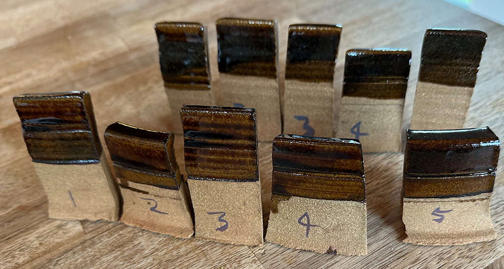 So unlike the Base glaze equivalent test where the 1:8 tiles seemed to be an improvement over the 1:10 samples, here the 1:10 and higher samples seem to be the best.