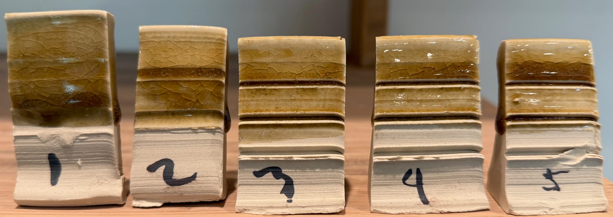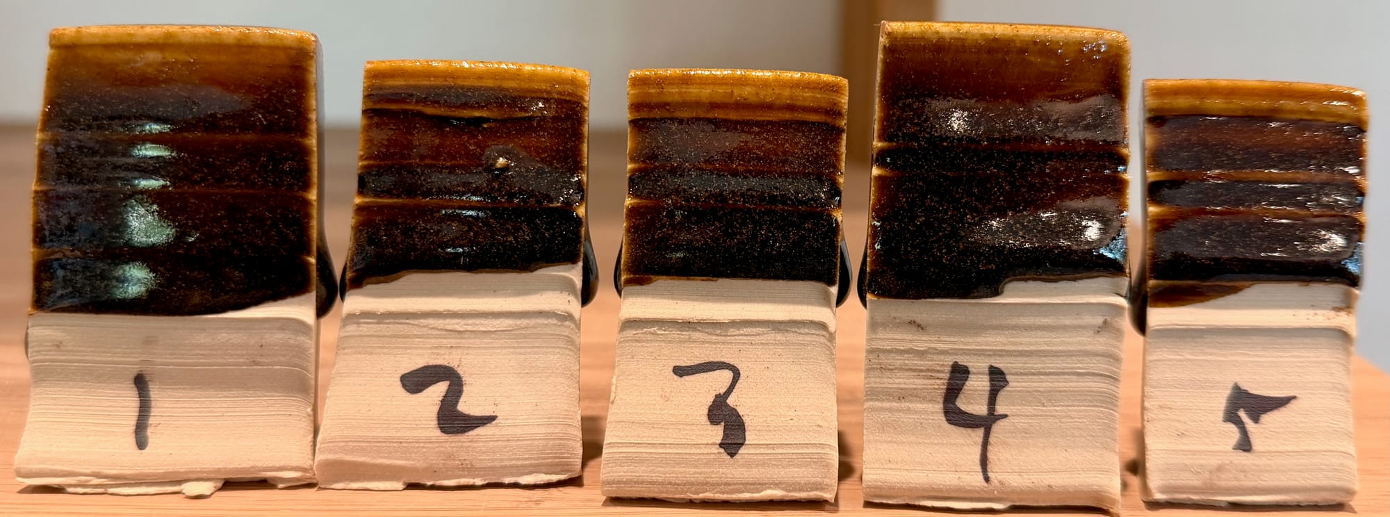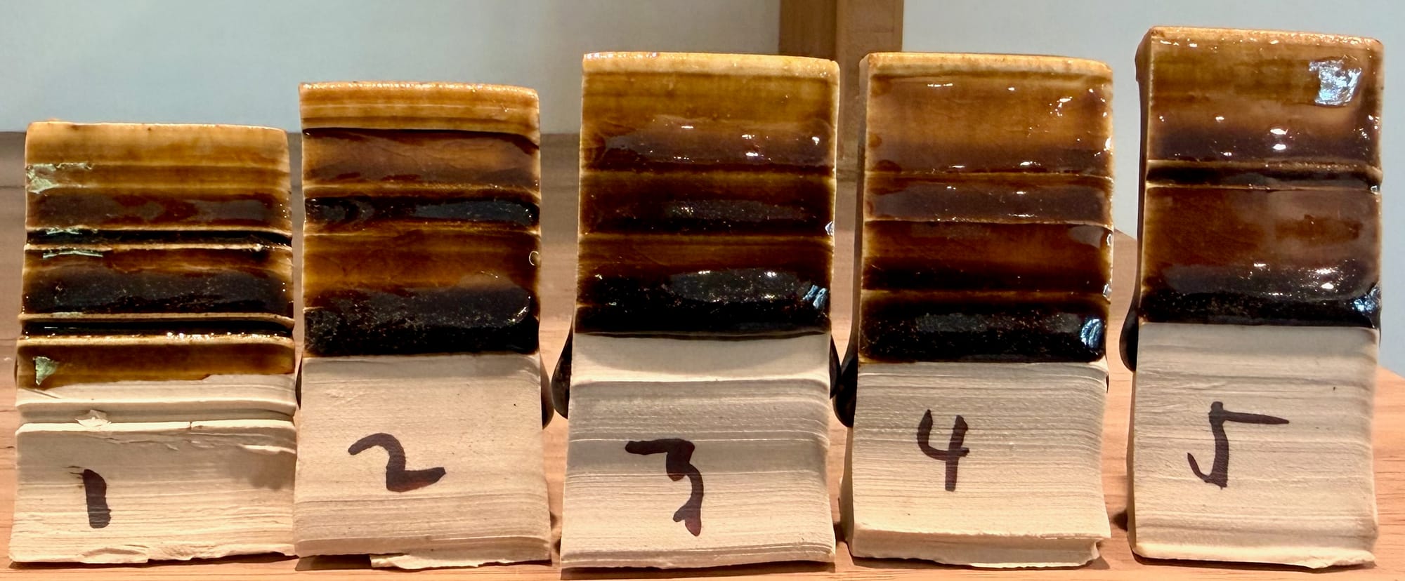 Tile #1, with no copper added, is noticeably darker and more brown in tone than in T52-1 due to the increased iron content. As copper carbonate is introduced in subsequent tiles, the glaze shifts from brown toward a richer amber hue, producing a subtle but pleasant warming effect. The underlying optical mechanisms remain the same as in earlier tests, with iron acting as the primary optical driver and copper functioning as a secondary modifier.