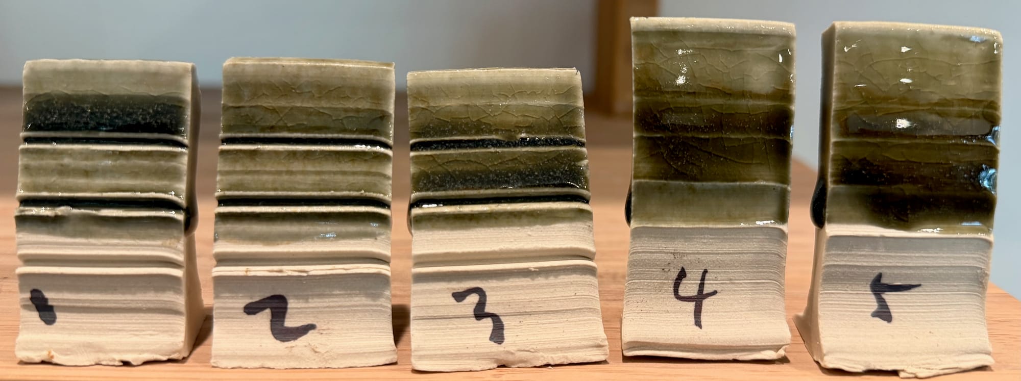 Test T53-1: In this test, 0.2% cobalt carbonate was added to the base glaze, after which copper carbonate was introduced in increments of 0.1%, producing a series at 0, 0.1, 0.2, 0.3, and 0.4%. (At these small quantities, measuring copper accurately on a triple-beam balance proved challenging.)