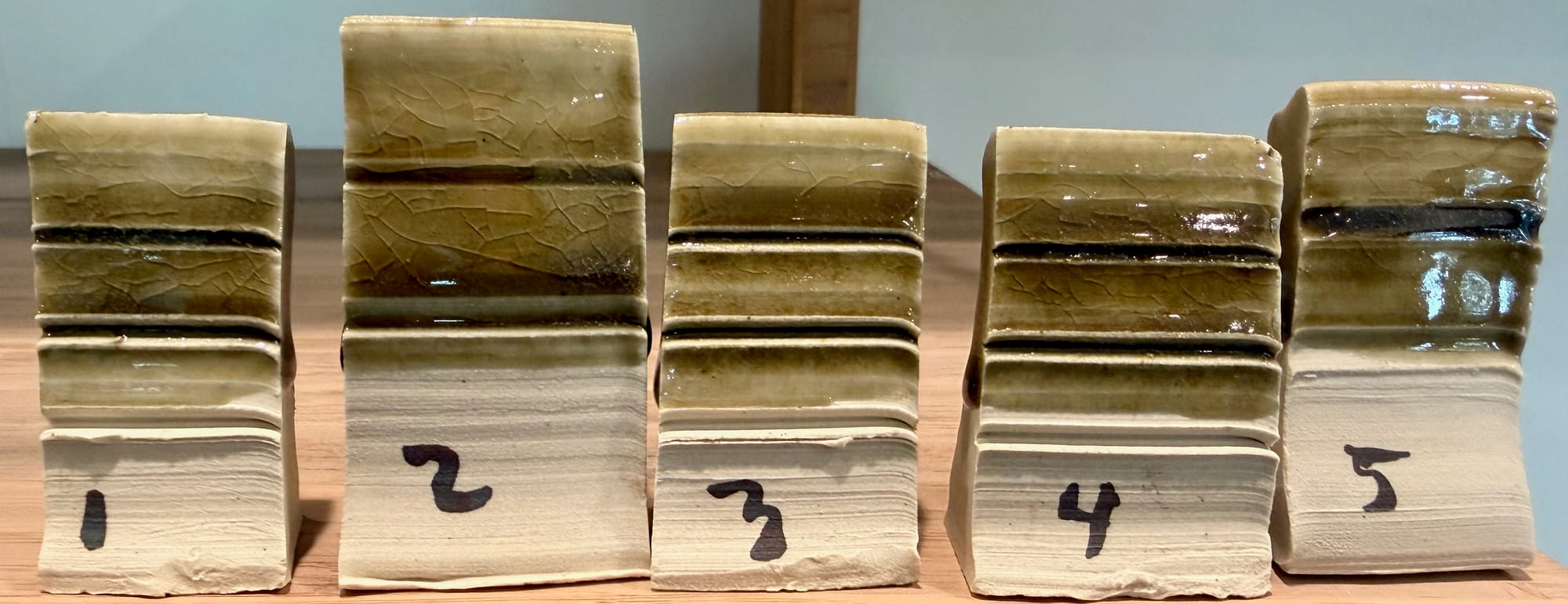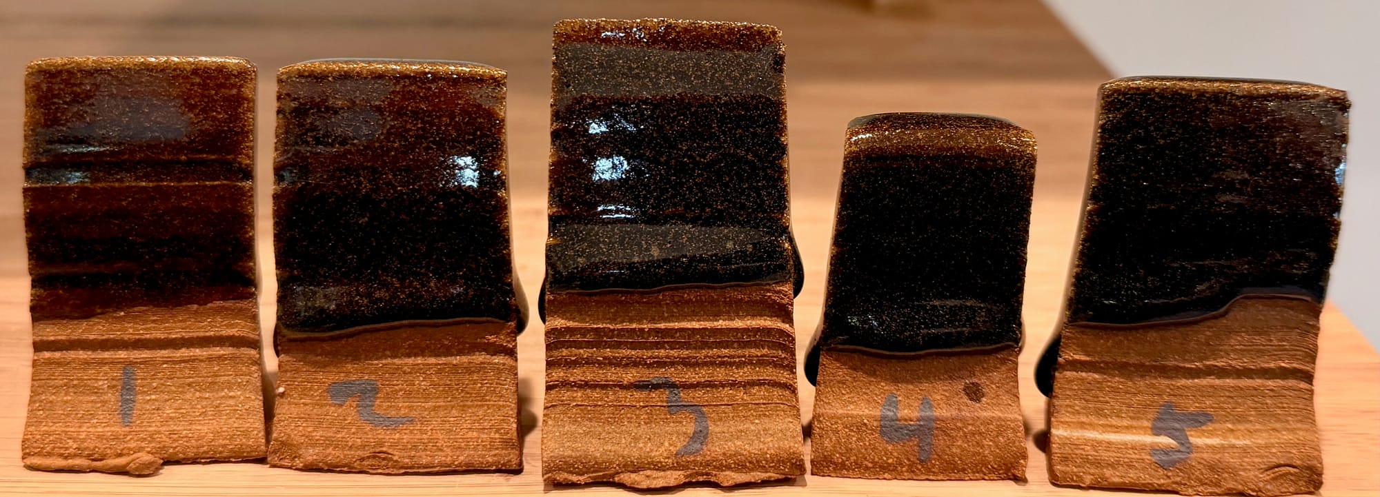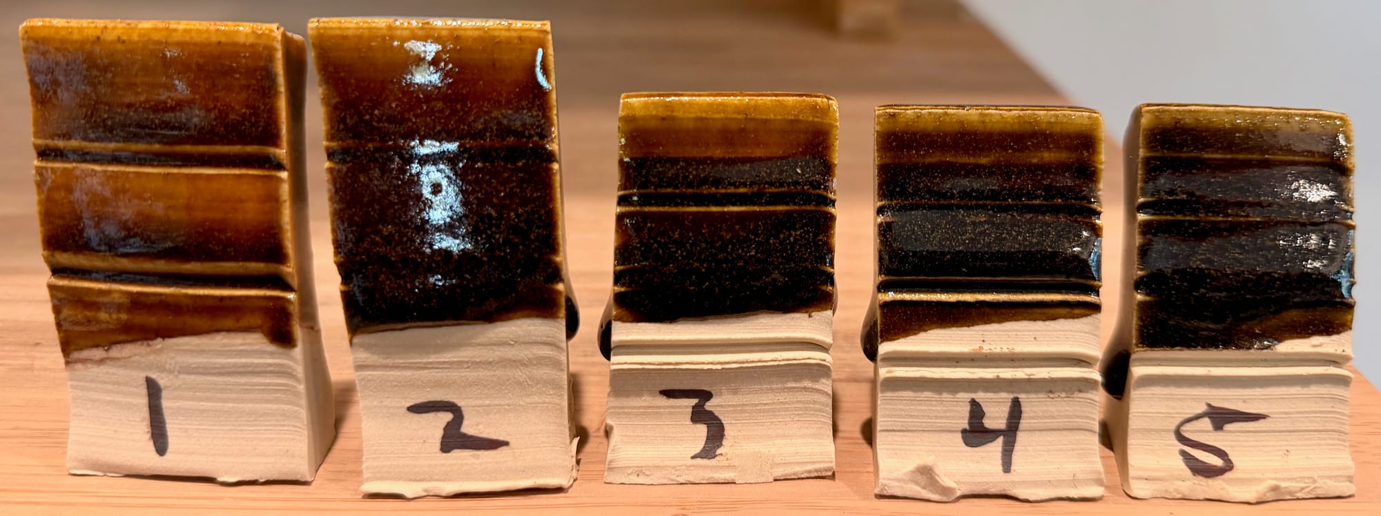 Although these results did not produce the black satin surface originally sought, the glazes are visually rich and cohesive, and they perform well on darker clay bodies.