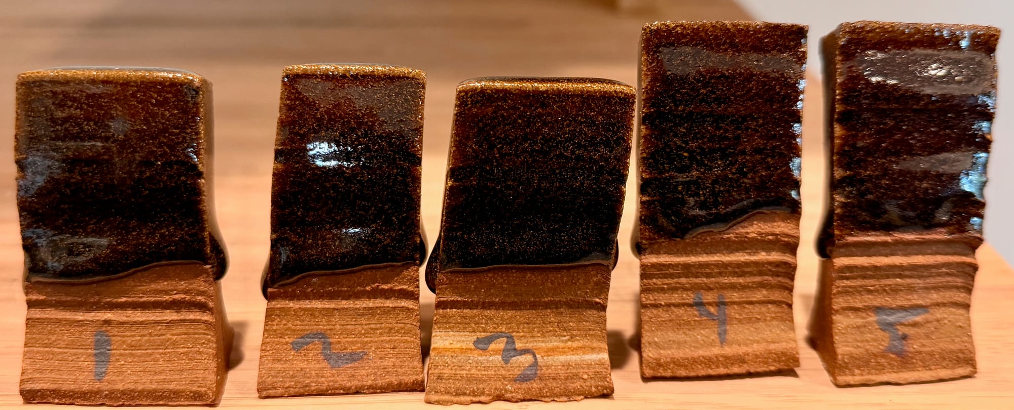 These experiments build on the previous tests but move into a richer and darker range of color. The working hypothesis was to take the MV Tenmoku base and introduce variations of copper and cobalt in an effort to tease out a very dark—or black-ish—satin glaze using the new cooling firing schedule.