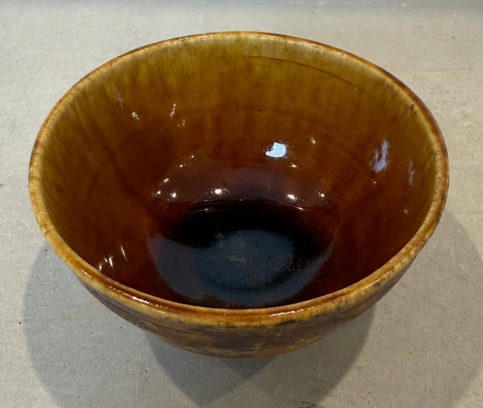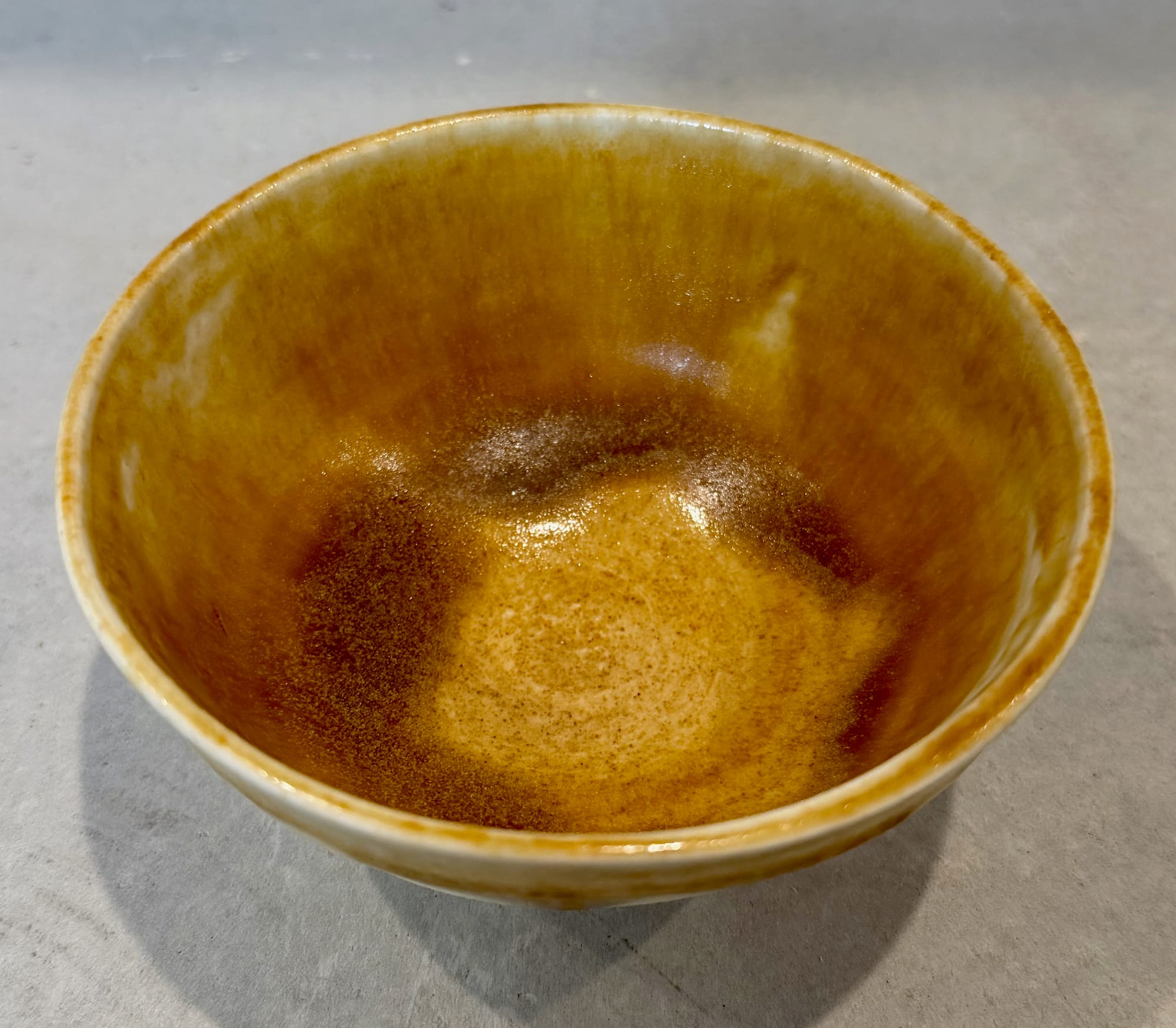 Interested to see more, the glaze from T52-1 #5 was applied to a porcelain cup (above). The result on the inside of the cup is a glassy glaze with a deep honey-amber or perhaps caramel hue that has beautiful moment and darkens with micro crystals where pooled. In this example, the glazed was brushed and some type of defect occurred in the middle, mostly likely it was simply left thin by accident. Similarly, on the outside the glaze was applied too thinly and became matte and dry.